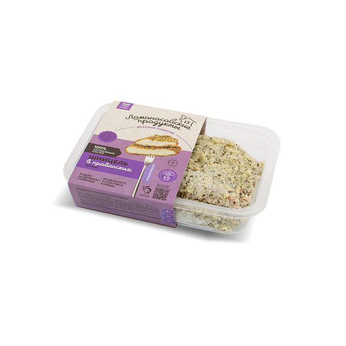 Филе грудки цыпленка-бройлера охлажденное, продукт экструдированных круп молотый пшеничный, смесь прованских трав (базилик, лук-порей, петрушка, орегано, розмарин, укроп (семена), тимьян), мука пшеничная, вода питьевая, яичный меланж сухой, соль, перец чёрный.