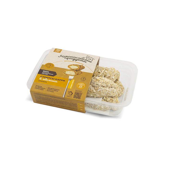 Филе грудки цыпленка-бройлера охлажденное, маринад карри (сметана (15% жирности), специя карри острая, чеснок сушёный, соль, перец чёрный), мука пшеничная, льезон (яичный меланж сухой, вода питьевая, соль), хлопья овсяные.